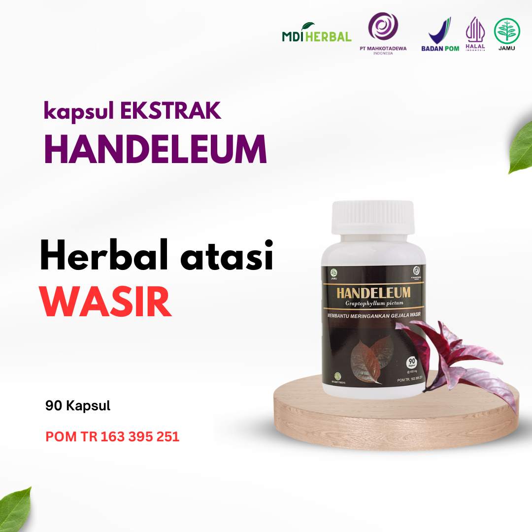 • Membantu meringankan wasir. Cara Konsumsi : 3 x 1 kapsul sehari Tiap kapsul mengandung : Ekstrak Handeuleum (Graptophyllum pictum folia) 400 mg POM TR 163 395 251