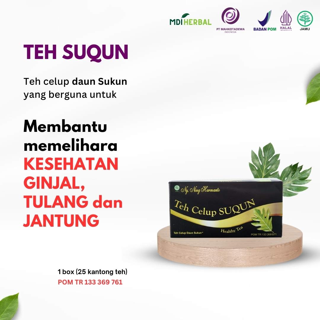 • Membantu memelihara kesehatan tulang dan jantung. Cara Konsumsi : Ambil 1 kantung teh suqun, seduh dengan 300 ml air mendidih selama 5 menit, tambahkan gula pasir, sajikan selagi hangat Komposisi : Artocarpus altilitis folium 1 g Camelia sinensis 0,5 g Angelica keiskei koidzumi folium 0,3 g TR 133 268 071