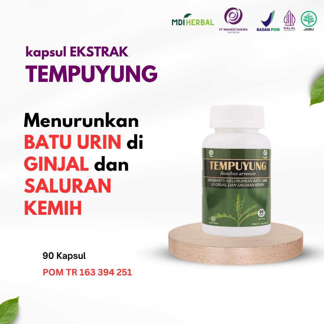 • Membantu meluruhkan batu urin di ginjal dan saluran kemih Cara Konsumsi: 3 x 1 kapsul sehari Tiap kapsul mengandung : Ekstrak Tempuyung (Sonchus Arvensis folium) 400 mg POM TR 163 394 251